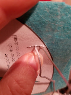 While I'm working on my shirt, I decide to do the little french knot detail on the shoulder piece. (Note how I haven't taped over the stitch mark.)